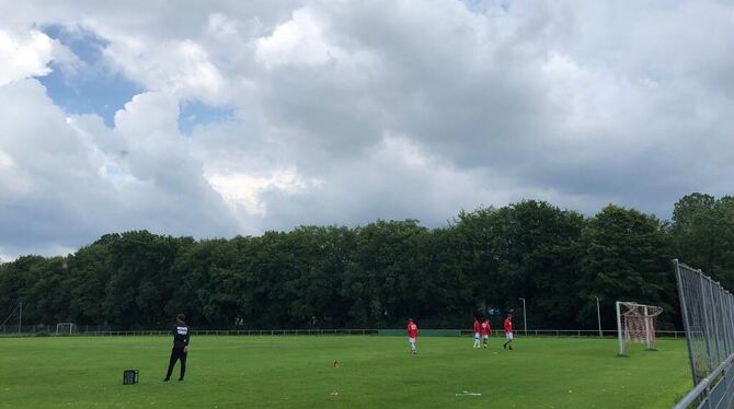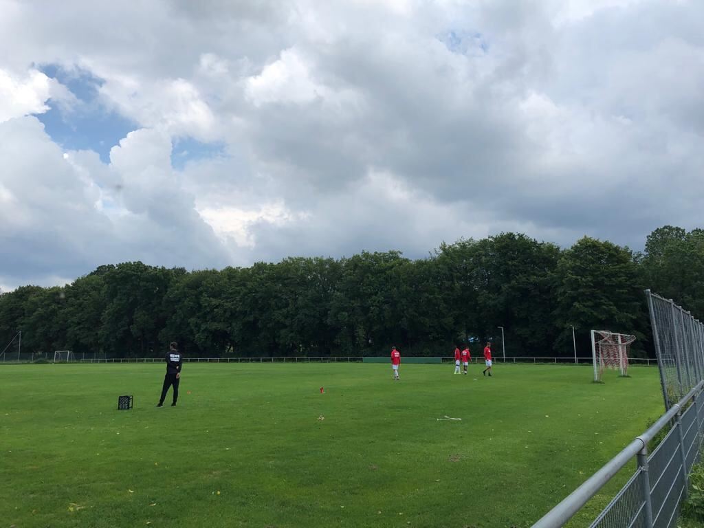 76. Minute: Aus ausgewechselten FC-Spieler absolvieren auf einem Nebenplatz des Kreuzeiche-Stadions noch eine lockere Trainingseinheit.
