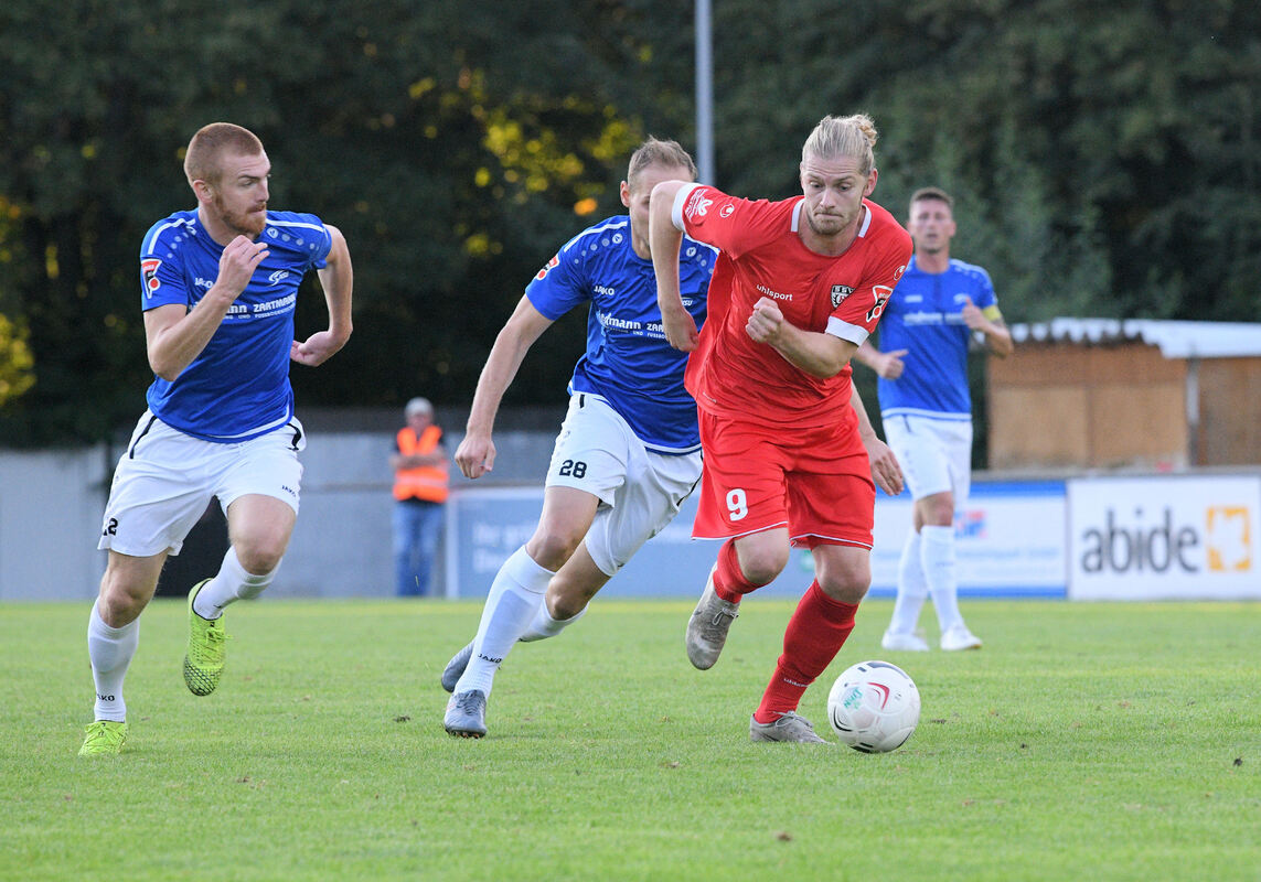 SSV-Trainer Maik Schütt schickte die gleiche Startelf auf den Platz, die am Samstag gegen Aufsteiger Walldorf II den ersten Saisonsieg eingefahren hat. Und wieder war der SSV von Beginn an das spielbestimmende Team. Willie Sauerborn hätte die Reutlinger in der 13. Spielminute in Führung bringen müssen. Doch der Mittelstürmer köpfte eine Flanke von Jonas Preuß freistehend aus rund sechs Metern nebend as Tor. Sechs Minuten später war Sauerborn am nächsten Aufreger beteiligt. Der 26-Jährige war alleine auf dem Weg zum Tor, ehe ihn Tobias Fausel von den Beinen holte. Für diese Notbremse sah der NSU-Verteidiger die Rote Karte. Glück hatten die Reutlinger in der 24. Minute: Eine Flanke von Maximilian Gebert landete auf der Latte. Im ersten Durchgang konnte der SSV aber seine Überzahl nicht mehr für Zählbares ausnutzen.