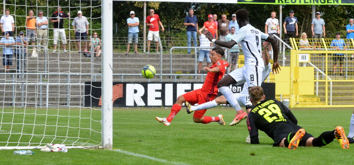In dieser Szene scheitert Dominic Sessa (rotes Trikot) an der Latte, später erzielt er das Ausgleichstor für den SSV.