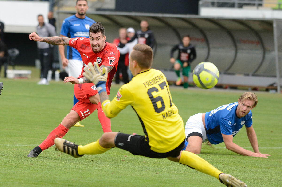 Das 3:0 für den SSV: Cristian Giles (links) lässt Marco Pischorn (am Boden) ins Leere laufen und überwindet Pascal Nagel. FOTO: PIETH
