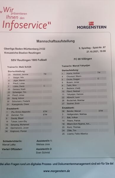 Halbzeit Der SSV Reutlingen und der FC 08 Villingen gehen torlos in die Pause. Bisher steht die Abwehr der SSV sicher, hat nur wenige Chancen zugelassen. Doch in den letzten Minuten vor der Pause wurden die Gäste stärker und haben ihr Potenzial in der Offensive aufblitzen lassen.