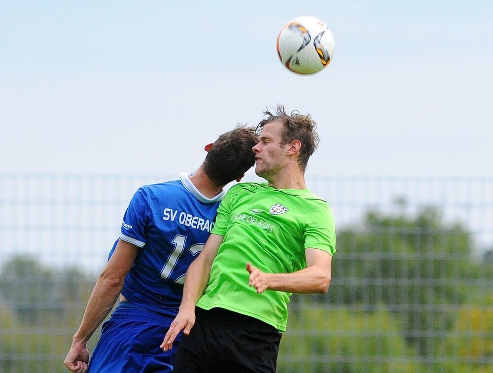 Im Luftkampf: Oberacherns Angreifer Domagoj Petric (links) und der umsichtige Reutlinger Innenverteidiger Magnus Haas. FOTO: BAUR