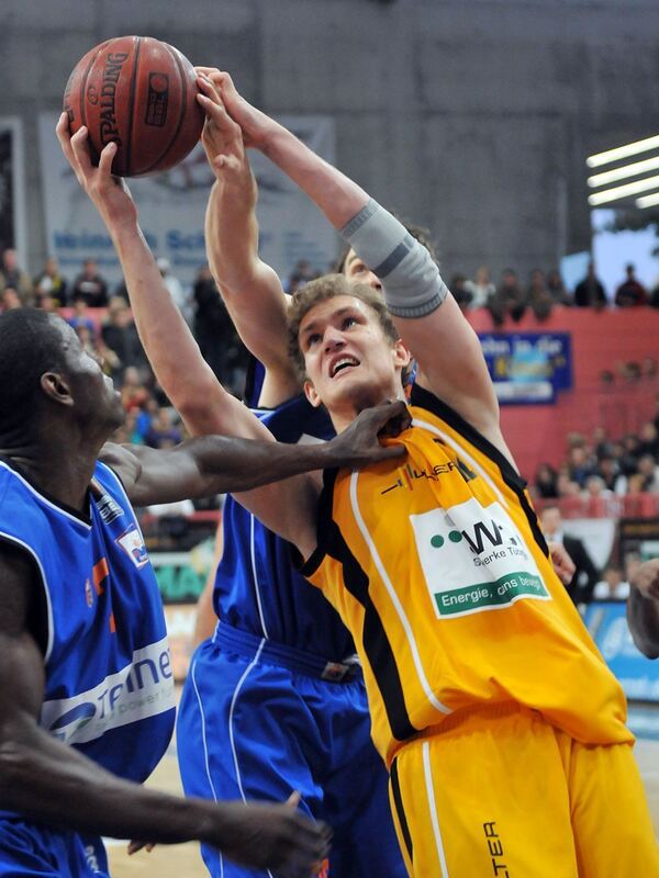 Zwei gegen einen: Der Tübinger Anatoli Kaschirow (rechts) behauptete sich gegen die Bayreuther Center-Kollegen Koko Archibong (links) und Jared Reiner (hinten).