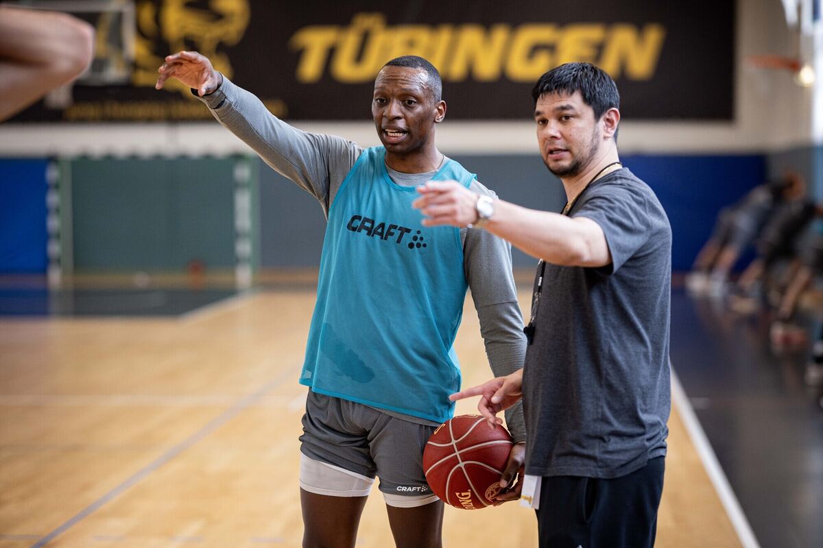 Tigers-Neuzugang Frank Gaines (links) im Gespräch mit Headcoach Danny Jannson beim Mannschaftstraining.