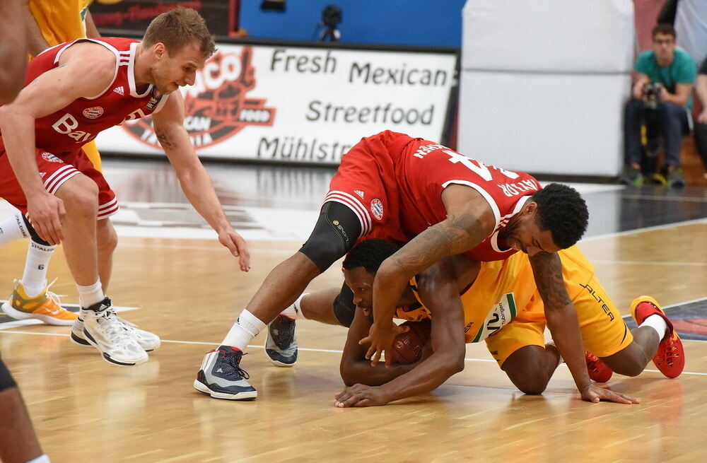 Die Bayern obenauf, auch wenn in dieser Szene der Tübinger Jimmy McKinney den Ball behauptet.