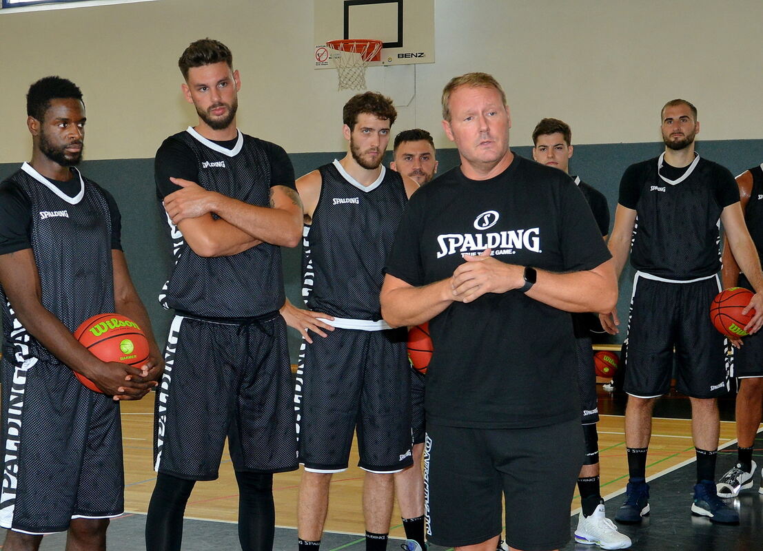 »Wir wollen attraktiven Basketball spielen«, sagte Tigers-Coach Doug Spradley (vorne) beim Trainingsauftakt. Aufmerksame Zuhörer (von links): Die Spieler Roland Nyama, Enosch Wolf, Tanner Graham, Besnik Bekteshi, Nemanja Nadjfeji und Niklas Ney.foto: niethammer