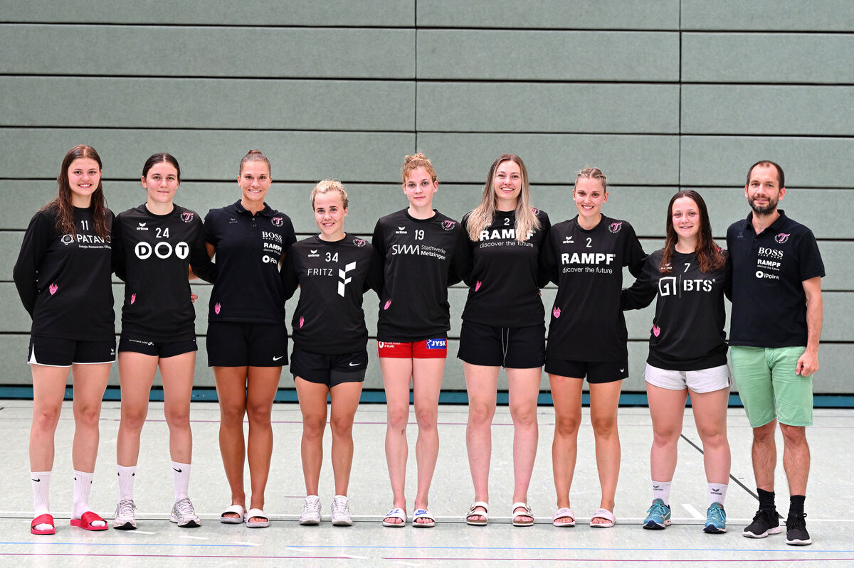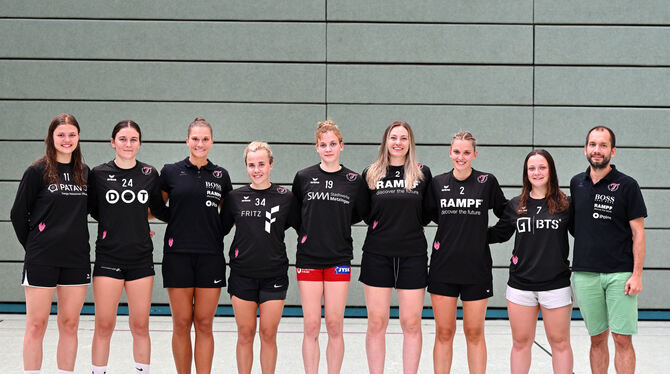 Neue Gesichter in Metzingen (von links): Marie Weiss, Tyra Bessert (von Kooperationspartner SG H2Ku Herrenberg), Julia Behnke, Sandra Erlingsdottir, Viktoria Woth, Lea Schüpbach, Laura Godard, Sabrina Tröster und Trainer Werer Bösch. Auf dem Bild fehlt Magda Balsam. FOTO: PIETH