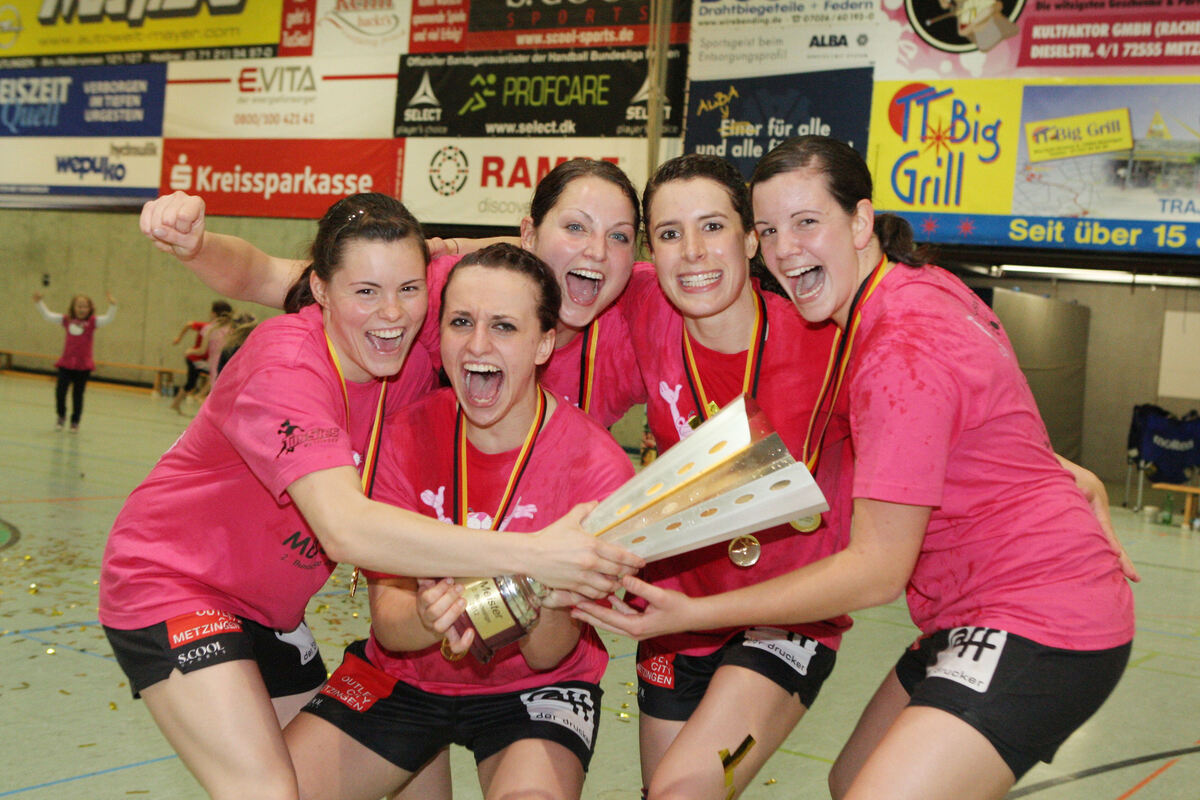 Am Freitag gibt’s ein Wiedersehen mit der Metzinger Aufstiegs-Mannschaft in die Bundesliga. Vor zehn Jahren jubelten (von links) Katharina Beddies, Carolin Tuc, Cassandra Engel, Patricia Stefani und Lisa Mößinger nach dem Gewinn des Zweitliga-Meister-Pokals. FOTO: EIBNER