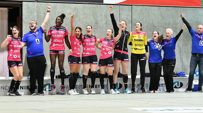 Metzinger Begeisterung bei der Schluss-Sirene. Da lässt auch Trainerin Edina Rott (Zweite von rechts) ihren Emotionen freien Lauf. FOTOS: MEYER