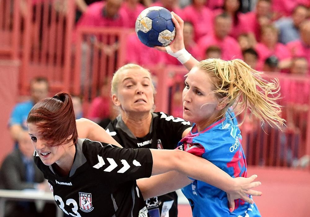 Kampfgeist: Die sechsfache TuS-Torschützin Tonje Löseth (rechts) setzt sich hier gegen (von links) Dunaujvaros-Torjägerin Anna Kovacs und Melinda Cincze durch.