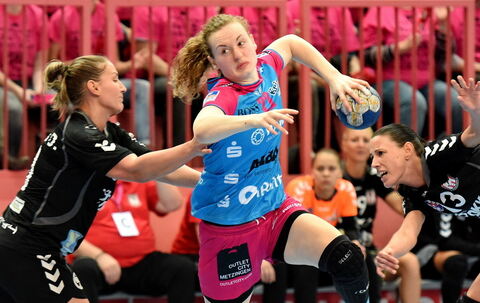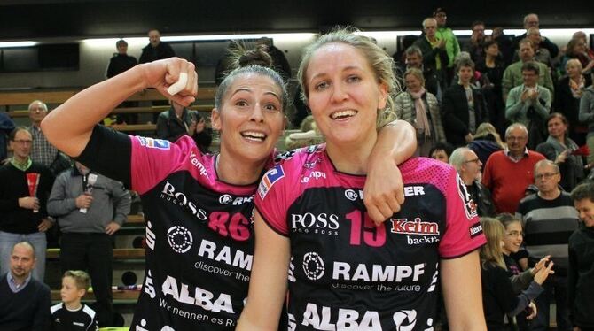 Bernadett Temes (links) und Tonje Loseth waren durch ihre Treffer die Garanten für den Sieg der TuS Metzingen. FOTO: EIBNER