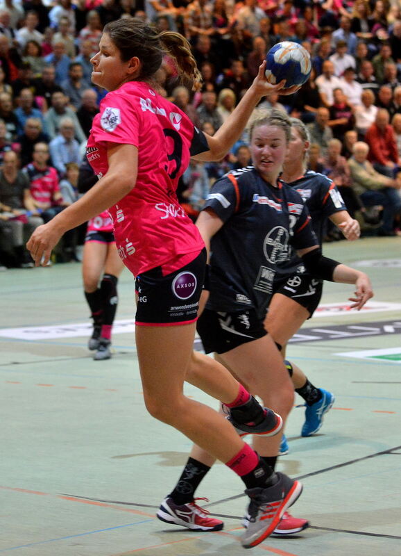 Klar im Aufwärtstrend: TuS-Rückraumspielerin Patricia Kovacs (links) erzielte beim Sieg zuletzt gegen Leverkusen vier Treffer. FOTO: NIETHAMMER
