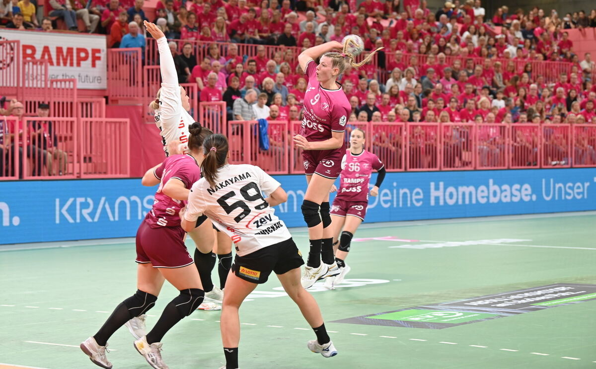Metzingens Rückraumspielerin Naina Klein (beim Wurf) macht ein starkes Spiel und trägt sich gegen Zwickau neun Mal in die Torschützenliste ein.