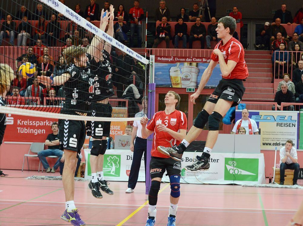 Auch dieser Schmetterball saß: TVR-Mittelblocker Hans Cipowicz (rechts) hatte einige starke Szenen. GEA-FOTO: PACHER
