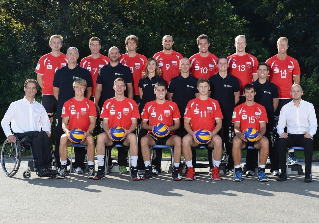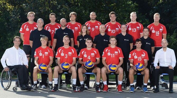 Mit diesem Personal nimmt der TV Rottenburg seine siebte Saison in der Volleyball-Bundesliga in Angriff. Hinten von links: Friederich Nagel (6), Sven Metzger (7), Felix Isaak (8), Aitor Canca Fernández (9), Nico Zager (10), Markus Pielmeier (13), René Bahlburg (14); Mitte von links: Oliver Heiming (Athletik-Trainer), Hans Peter Müller-Angstenberger (Trainer), Jenny Justen (Physiotherapeutin), Dr. Maik Schwitalle (Mannschaftsarzt), Karsten Haug (Co-Trainer), Markus Weiß (Scout); untere Reihe von links: Jörg Papenheim (Manager), Dirk Mehlberg (1), Michael Neumeister (3), Federico Cipollone (4), Nico Rukavina (11), Willy Belizer (15), Philipp Vollmer (Eventmanager). Es fehlen: Hans Cipowicz (5), Conny Dieterle (Physiotherapeutin). FOTO: PR