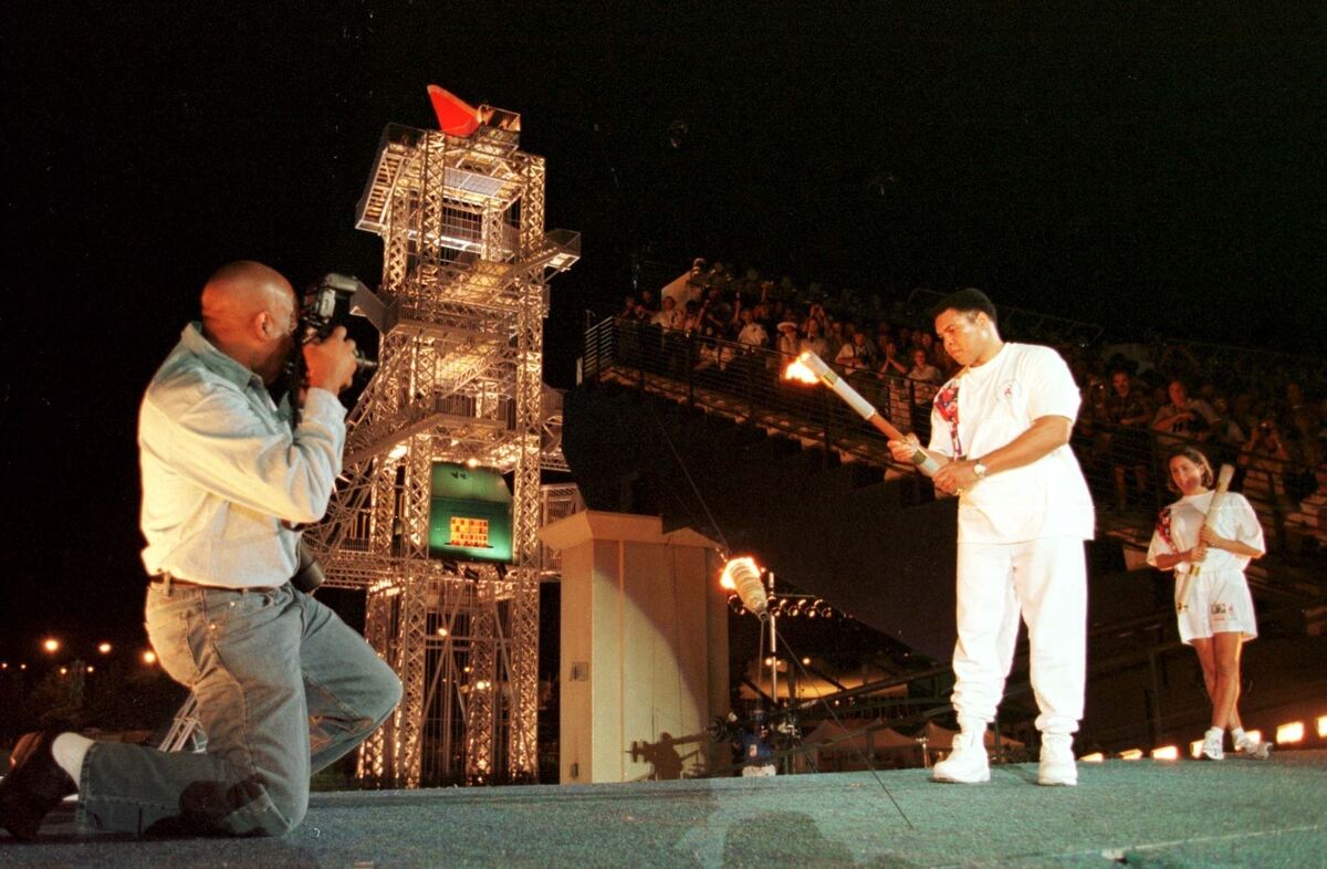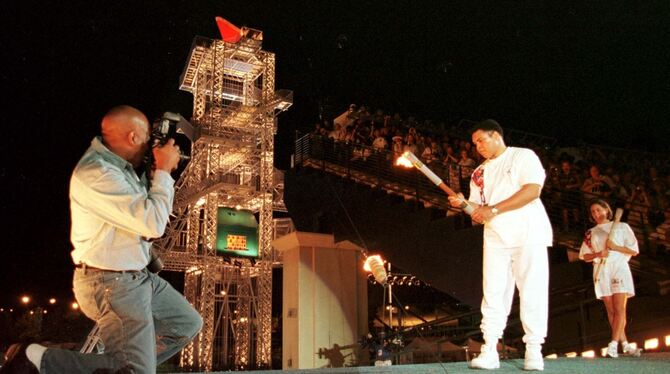 »Meine linke Hand zitterte wegen Parkinson, die rechte vor Angst.« Muhammad Ali läuft mit der Fackel, um das olympische Feuer in Atlanta 1996 zu entzünden. FOTO: WITTERS