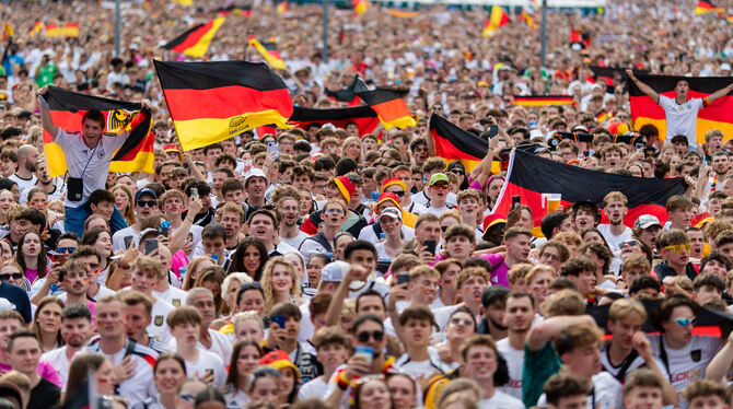 Deutschland-Fans sehen sich das in der Fan-Zone auf dem Schlossplatz ein Spiel an.
