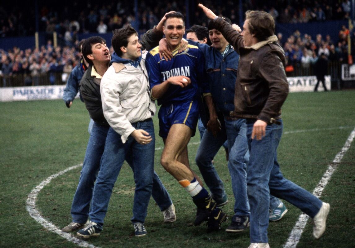 Beliebtes Raubein: Vinnie Jones (Mitte) wird 1988 von Fans nach einem Sieg Wimbledons über Watford gefeiert. FOTO: WITTERS