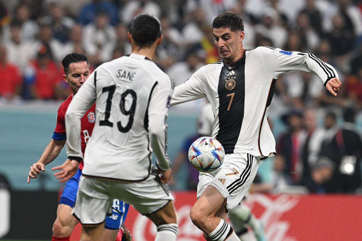 Deutschlands Kai Havertz (r) spielt gegen Bryan Oviedo von Costa Rica. Davor steht Deutschlands Leroy Sané.