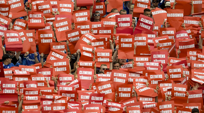 Schalker Fans zeigen dem Aufsichtsratsvorsitzenden Clemens Tönnies im DFB-Pokal die Rote Karte.foto: dpa