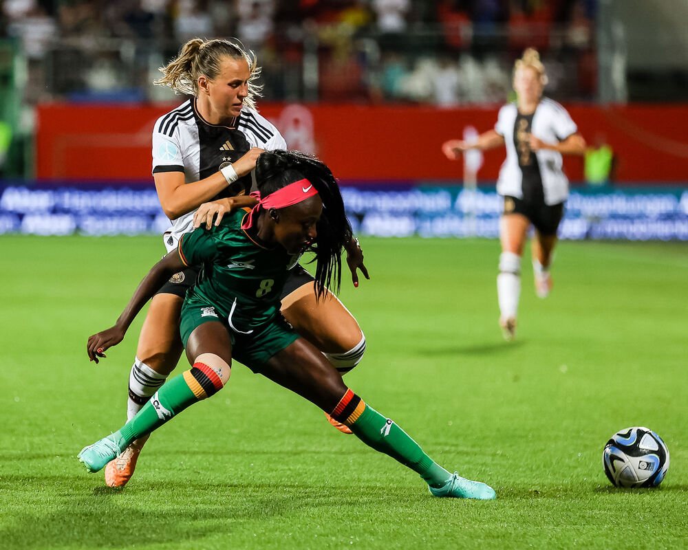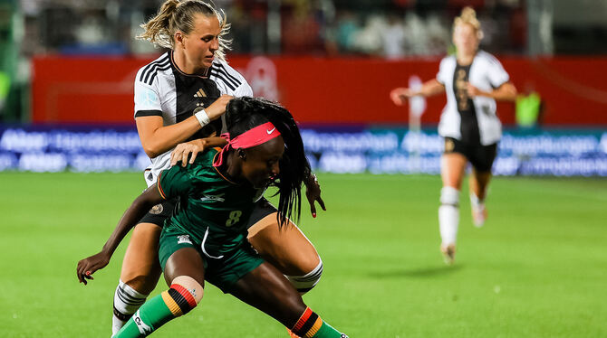 Sydney Lohmann (rechts) im Testländerspiel Deutschlands gegen Sambias Belemu Margaret.