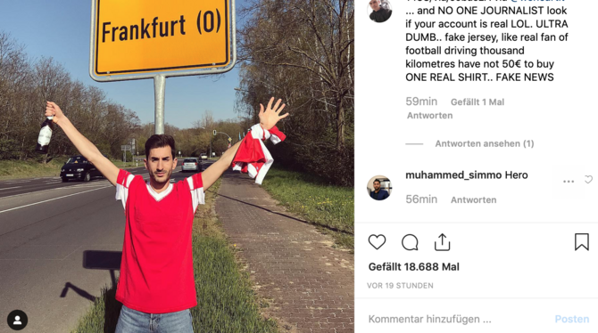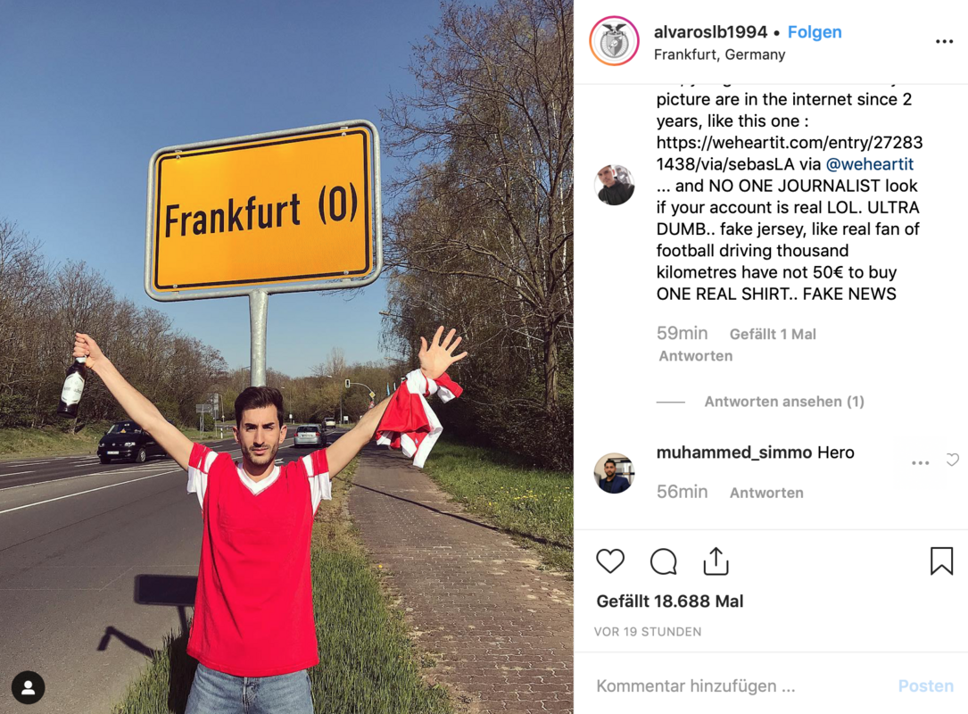 Einige halten den Fauxpass schon früh für einen Fake. Die Fans würden keine echten Benfica-Trikots tragen, außerdem sei bei der geposteten Route schon ersichtlich gewesen, dass sie ins falschen Frankfurt reisen. Mittlerweile stellte sich heraus: Die Geschichte von der Irrfahrt war tatsächlich gefälscht. Wie die Onlineportale T-Online und Watson berichten, habe es sich bei der Aktion um ein Marketing-Gag für das Magazin »11 Freunde« gehandelt. Alvaro Oliveira sei in Wirklichkeit Schauspieler, lebe in Berlin und heiße Marcelo Rodrigues. Auf dem Instagram-Account, dem die Geschichte entstammt, wurde gegen 15 Uhr ein Foto mit der Mai Ausgabe von »11 Freunde« veröffentlicht. Daneben der Satz: Eines der wenigen Magazine, denen du vertrauen kannst. Die Insta-Story mit den Bildern der angeblichen Tour wurde um einige Slides ergänzt. Darauf sind einige Internetseiten zu sehen, die über Alvaro Oliveira alias Marcelo Rodrigues berichtet haben. »Was für ein verrückter Tag - aber ich habe es ins deutsche Fernsehen geschafft«, heißt es am Schluss. (GEA)