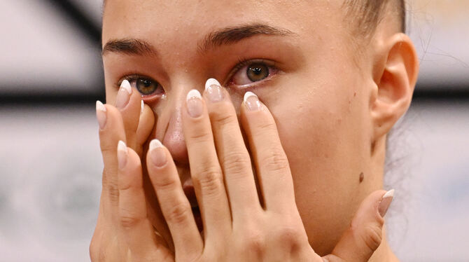 Kann kaum glauben, dass sie am Schwebebalken in Stuttgart die Konkurrenz hinter sich gelassen hat: Die erst 17 Jahre alte Turnerin Jessica Schlegel aus Leipzig. FOTO: MURAT/DPA