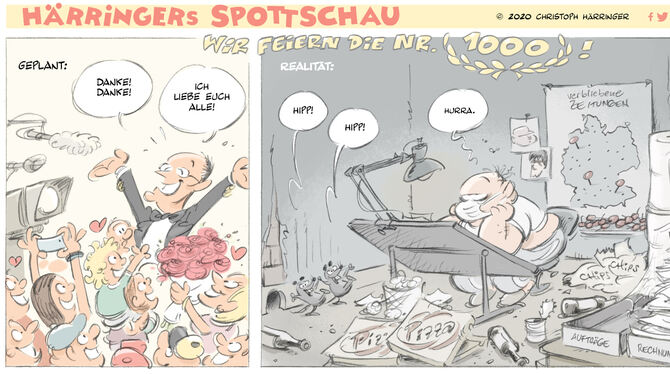 Christoph Härringer aus Freiburg ist so alt wie die Fußball-Bundesliga und lebt nach jahrelangen Stationen in Paris und Barcelona in Berlin. Er entwarf einige Comicserien sowie zahlreiche Characters und Maskottchen. Für die von Reutlinger General-Anzeiger und Neuer Osnabrücker Zeitung gegründete Regionalzeitungskooperation zeichnet Härringer seit 2005 seine Spottschau. Härringer ist in Deutschland der erfolgreichste Zeichner auf dem Fußballsektor und aus den Regionalzeitungen nicht mehr wegzudenken. Die Zahl seiner Fans ist riesig, sein Comic Nummer 1 000 ziert diese Seite. (cfi)