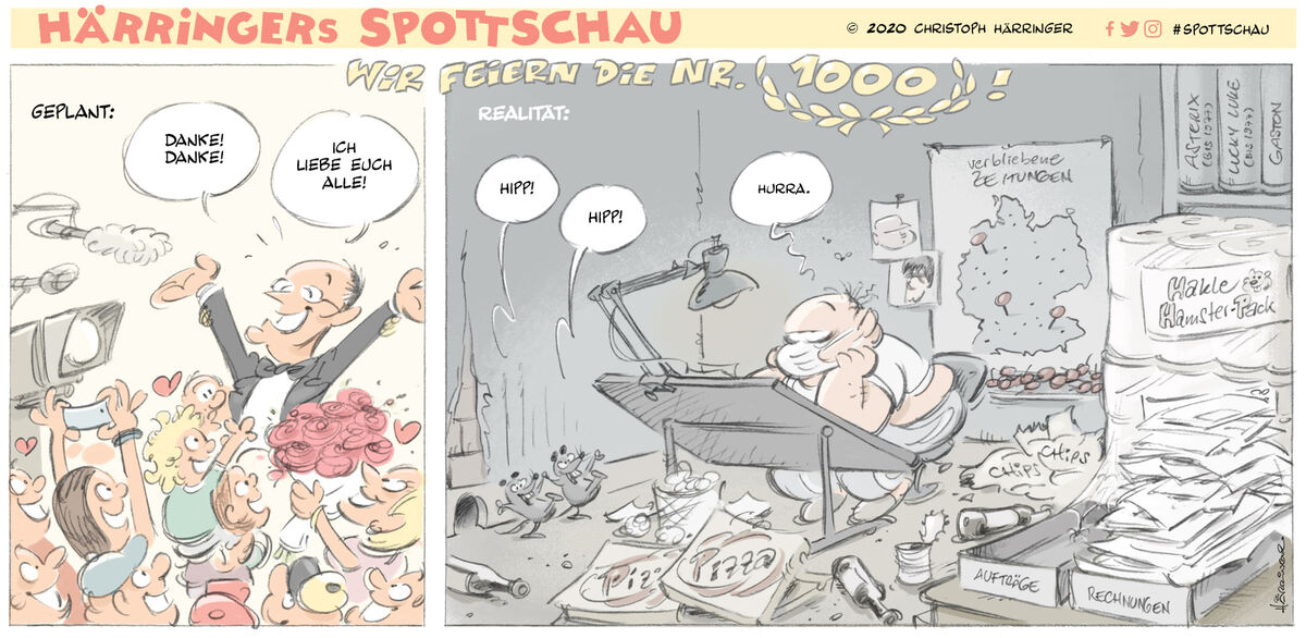 Härringer: Christian Drosten hat gesagt, dass er sich als Comicfigur in der Zeitung sah und ihm dabei schlecht wurde. Immerhin hat er sich anscheinend erkannt (lacht). Die Virologen musste ich genauso angehen wie die Fußballer und habe mir über jeden eine kleine Bilddatenbank angelegt. Das hätte in der Anfangszeit viel zu lange gedauert, aber jetzt weiß ich, dass es geht.