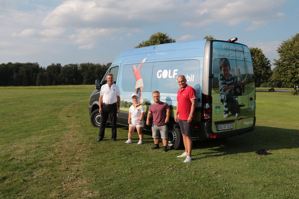 Nach der Golf-Runde (von links): Otto Leibfritz, der Initiator des Turniers, mit den Para-Sportlern Jennifer Sräga und Niko Kappel sowie VfB-Fußball-Legende Hansi Müller. FOTO: VERBAND