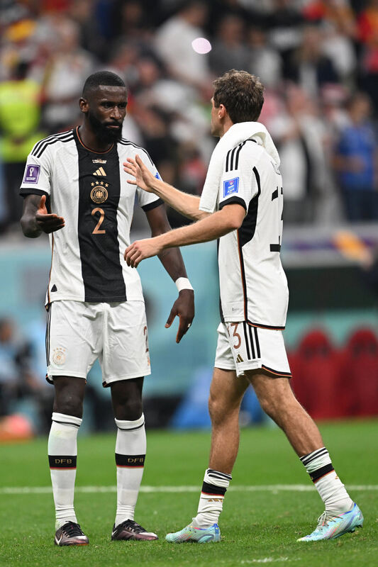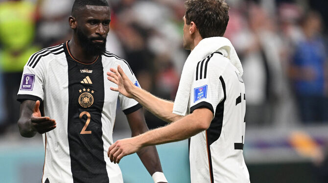 Deutschlands Thomas Müller (r) und Antonio Rüdiger klatschen nach dem Spiel ab.