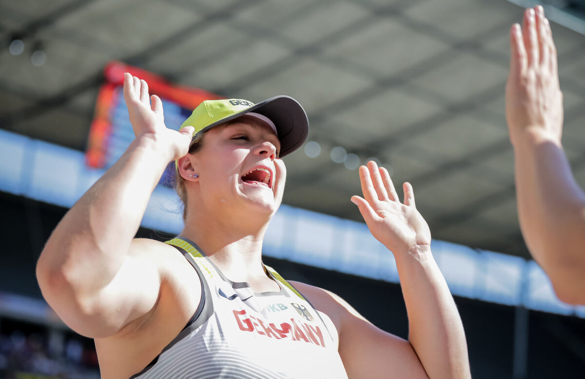 Gleich mit ihrem ersten Stoß knackte die 32 Jahre alte Zwillingsmutter Christina Schwanitz mit 18,83 Metern die geforderte Weite von 17,20 Metern. FOTO: DPA