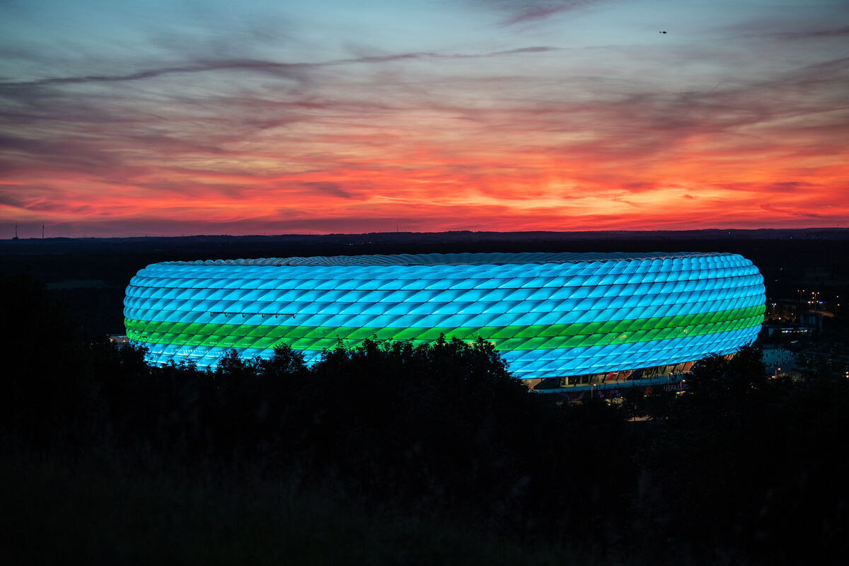 Das Stadion ist in den Farben türkis und grün beleuchtet.