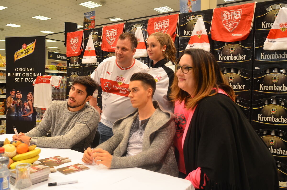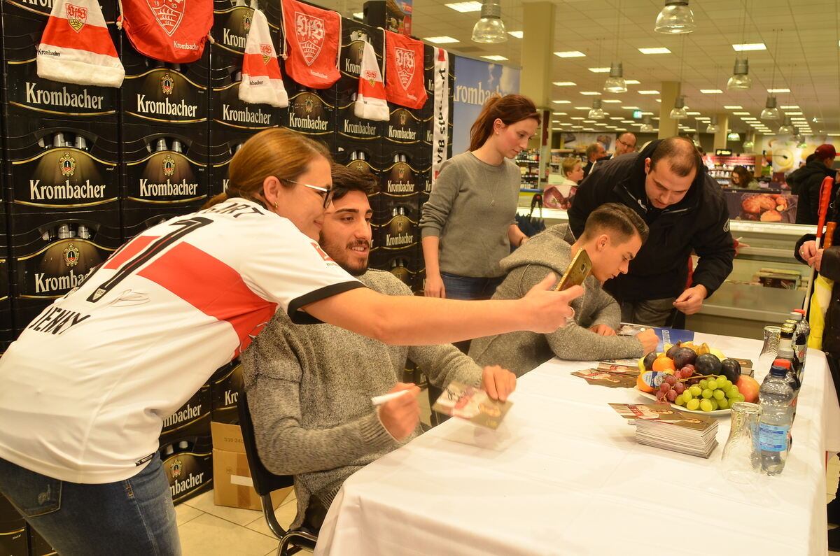REUTLINGEN. Beim großen Edeka in der Reutlinger Emil-Adolff-Straße sitzen am Montagabend zwei Mittelfeldspieler passenderweise im Mittelpunkt des Publikumsinteresses: Berkay Özcan und Erik Thommy beglückten zwischen salzigem Knabbergebäck und tiefgefrorenen Torten eine lange Schlange von Fans.