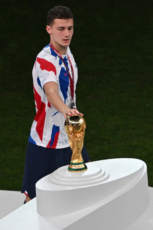 Frankreichs Benjamin Pavard darf den WM-Pokal bloß kurz streicheln. FOTO: MICHAEL/DPA