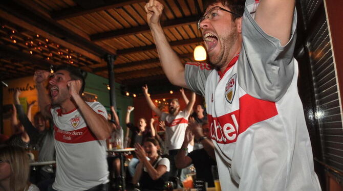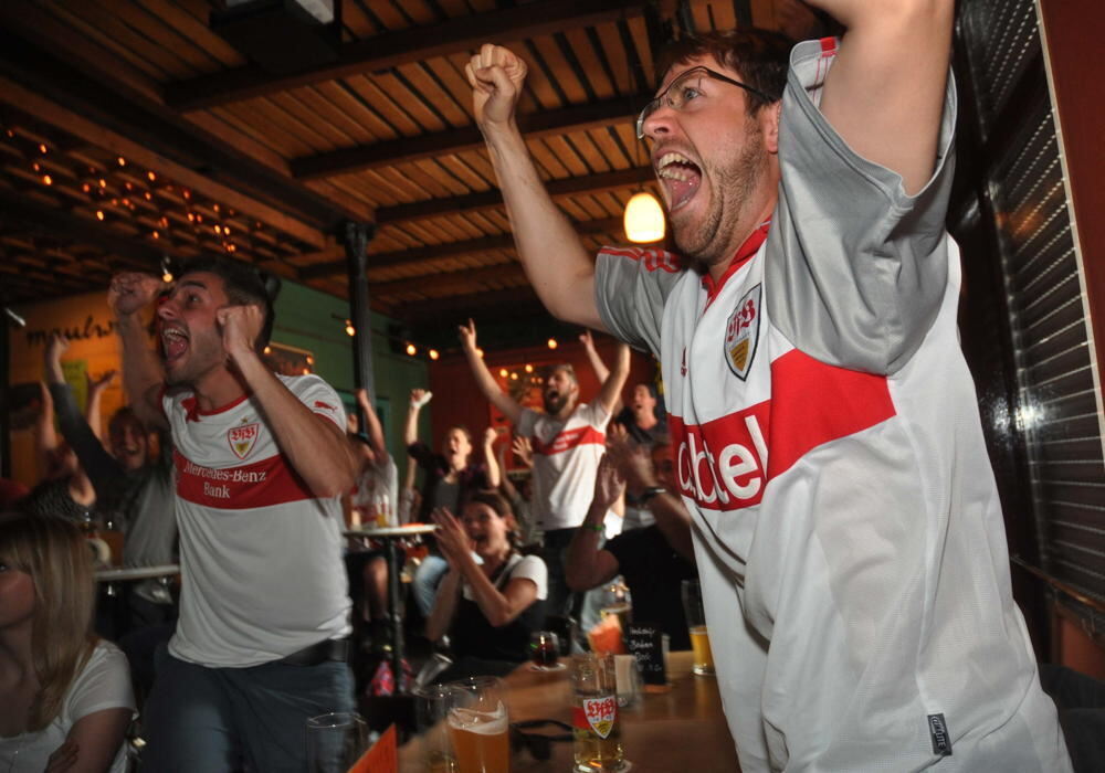 Stuttgart Fans jubeln über ein Tor des VfB gegen den Hamburger SV in einer Kneipe in Stuttgart