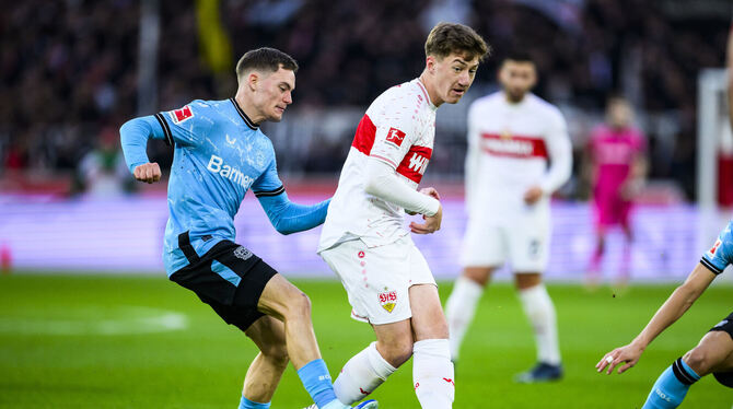 Behält den Überblick: VfB Stuttgarts Angelo Stiller (rechts) im Duell gegen Bayer Leverkusens Torschütze Florian Wirtz.