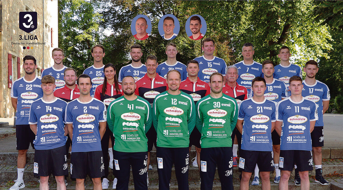 Mit dieser Mannschaft nimmt der VfL Pfullingen die Handball-Drittliga-Saison 2021/22 in Angriff. Hinten von links: Marius Klingler, Lukas Fischer, Lukas List, Jason Ilitsch, Paul Prinz, Alexander Schmid, Lasse Schiemann; mittlere Reihe von links: Florian Möck, Co-Trainer Tobias Stoll, Physiotherapeutin Jessica Vöhringer, Trainer Daniel Brack, Athletiktrainer Tobias Fluck, Mannschaftsarzt Dr. Ulrich Dobler, Christian Jabot, Philipp Mager; vorne von links: Julius Schmidt, Felix Zeiler, Valentin Bantle, Simon Tölke, Daniel Schlipphak, Mathis Roth, Frieder Nothdurft; oben eingeklinkt von links: Torwarttrainer Michael Villgrattner, Niklas Roth, Physiotherapeut Moritz Eitel.