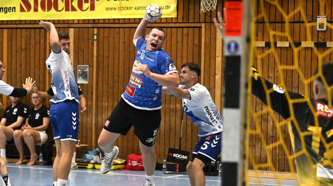 Paul Prinz (mit Ball) vom VfL Pfullingen setzt sich beim 28:28 im Vorbereitungsspiel gegen zwei Kornwestheimer Abwehrspieler durch. FOTO: PIETH