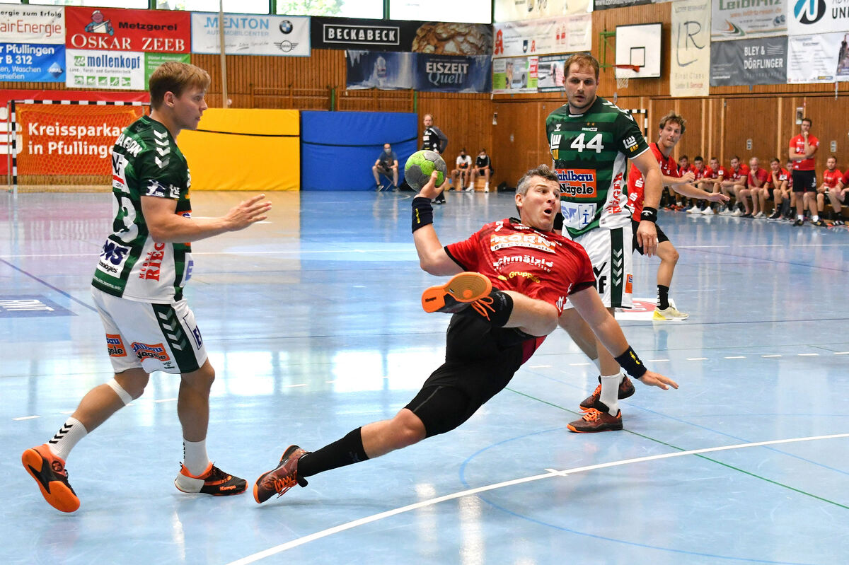 Pfullingens Kreisläufer Alexander Schmid mit einer sehenswerten Flugeinlage. Kresimir Kozina von Frisch Auf Göppingen in der Beobachter-Rolle. FOTO: PIETH