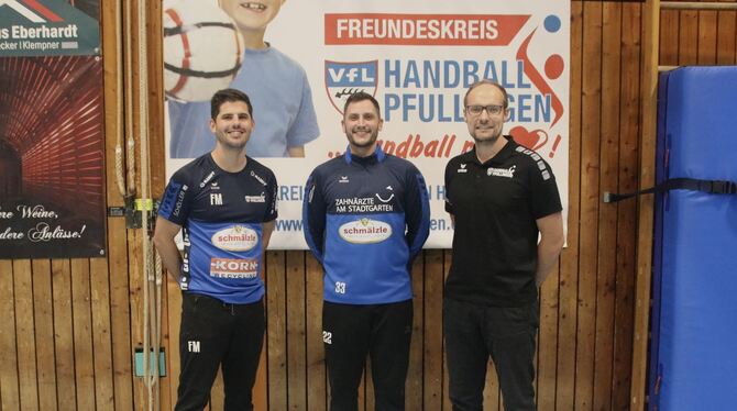 Der erfahrene Rückraumspieler Patrick Rapp (Mitte) verstärkt den VfL Pfullingen. Links: Trainer Florian Möck, rechts: Simon Tölke, Sportlicher Leiter.