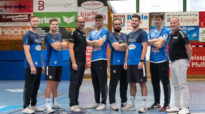 Die Neuen des VfL Pfullingen. Von links: Marius Spitz, Co-Trainer Christian Jabot, Sportvorstand Simon Tölke, Lukas Dietrich, Valentin Bantle, Trainer Florian Möck, Tobias Haag, Abteilungsleiter Armin Geffke.