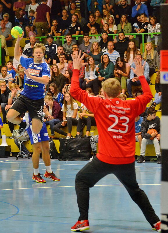 Stehen sich auch morgen in der Kornwestheimer Sporthalle Ost gegenüber: Der Pfullinger Linksaußen Marc Breckel und Torhüter Pascal Welz. Foto: Niethammer