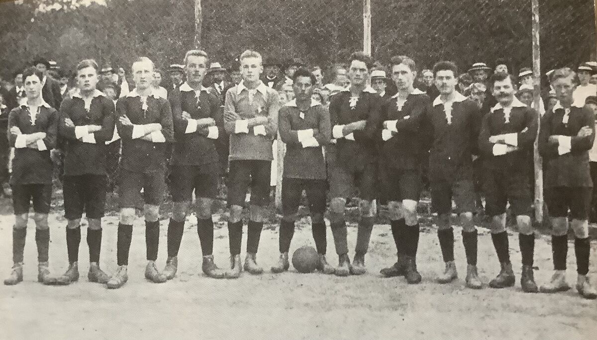 Coole Truppe, flott gekleidet: Die SVO-Mannschaft von 1923 mit Wilhelm Nerz, Wilhelm Kemmler, Julius Hack, Gustav Maier, Gastspieler, Karl Hoch, Gottlob Widmann, Georg Bauer, Gastspieler, Gastspieler, Karl Kemmler. REPRO: G. FAUSER