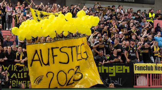 Aufstieg 2023: Überschwängliche Freude bei Tigers-Fans und Distanzschütze Erol Ersek über das Erreichen des großen Ziels. FOTOS: DUDDEK/EIBNER