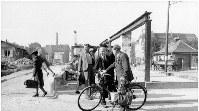 Oskar Kalbfell, am Abend des Einmarsches der Franzosen zum kommissarischen Oberbürgermeister ernannt, im Gespräch vor dem zerstörten Adler-Areal im Oktober 1946.
