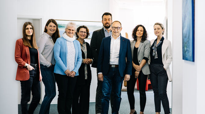Das Team von Reutter Immobilien in Münsingen: Uwe Reutter (dritter von rechts) legt Wert auf eine familiäre Atmosphäre. Foto: PR