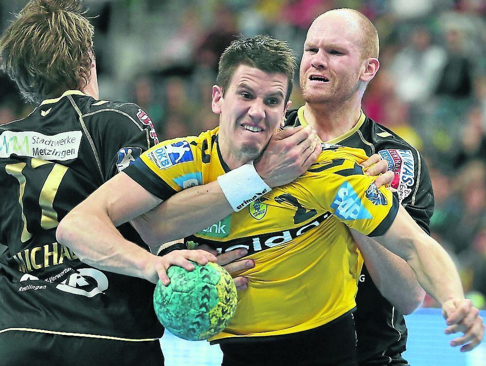 Energisch zupacken heißt die Devise für die Neuhäuser Ferdinand Michalik (links) und Alexander Becker. Mit Ball: Andy Schmid von den Rhein-Neckar Löwen. FOTO: EIBNER