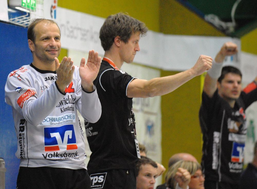 Jubel beim TV Neuhausen: (von links) Torhüter Milos Slaby, Trainer Markus Gaugisch und Aleksandar Stevic. FOTO: EIBNER