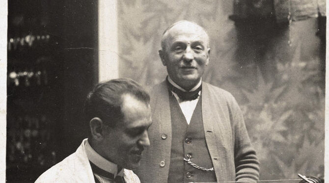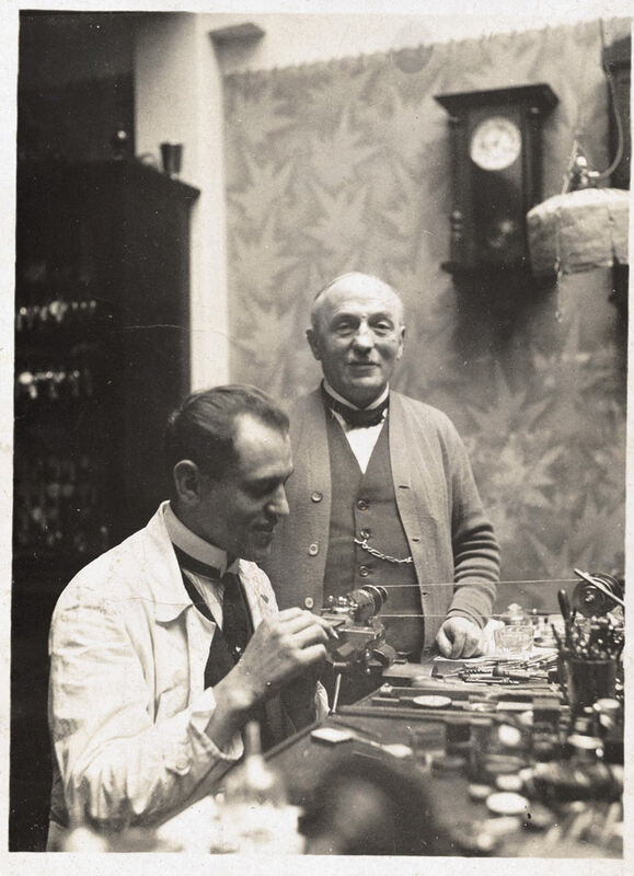 Firmengründer Albert Depperich, der Urgroßvater von Inhaber Peter Voss, mit einem Uhrmacher. Foto: PR
